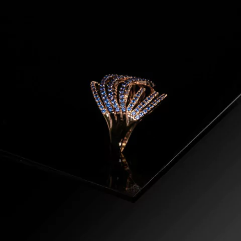 Anel folheado a Ouro Amarelo com arabescos em ondas e sete fileiras cravejadas de Zirconia azul.